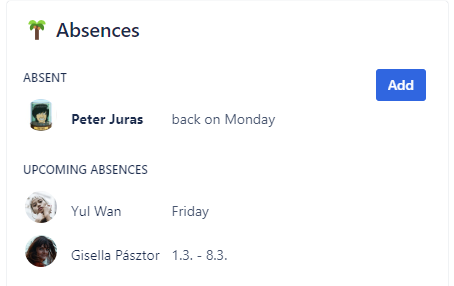 The Absences gadget can be used by Jira users to add their absences to make everyone aware of their absences.
